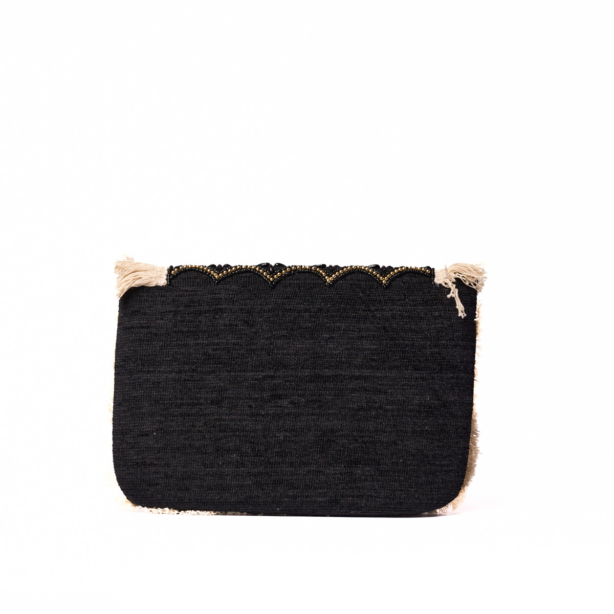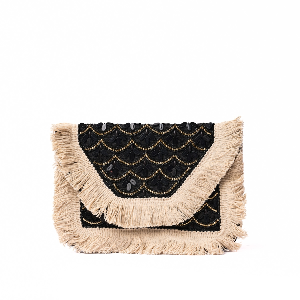 Γυναικεία τσάντα φάκελος σε boho chic ύφος, σε εντυπωσιακό συνδυασμό μαύρου και εκρού. Ξεχωρίζει για το ιδιαίτερο διακοσμητικό σχέδιο στο καπάκι, τις εντυπωσιακές λεπτομέρειες με κρόσσια και το κομψό της σχήμα, που την κάνουν ιδανική επιλογή για καλοκαιρινές εμφανίσεις, νησιώτικα looks, βραδινές εξόδους και resort outfits. Μια κομψή boho τσάντα χειρός που συνδυάζει στυλ και μοναδικό χαρακτήρα, προσθέτοντας fashion statement σε κάθε σύνολο.