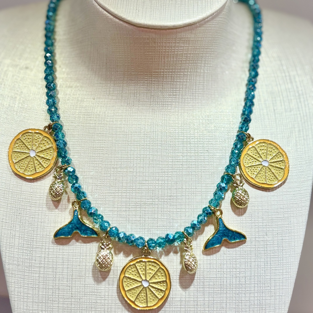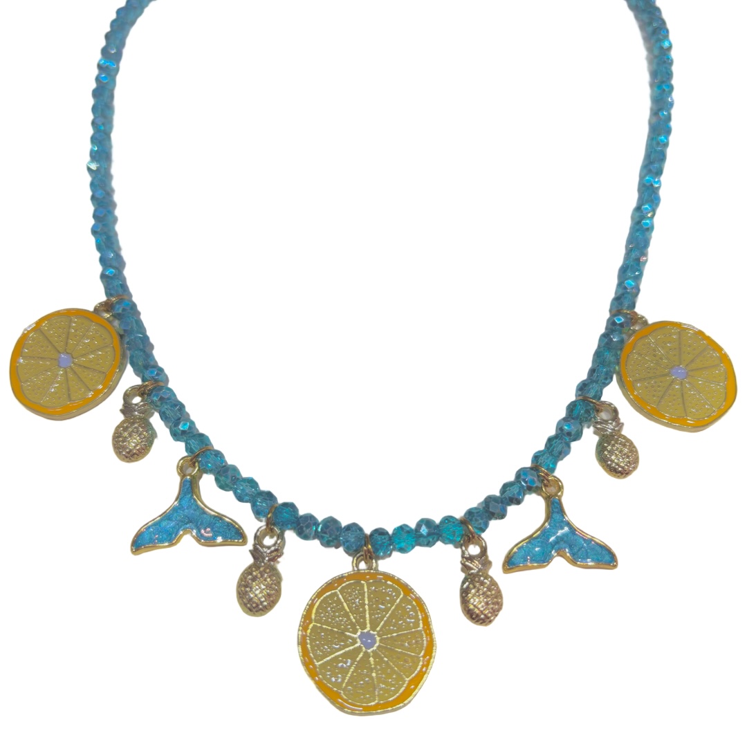 Κολιέ με γαλαζοπράσινες χάντρες και ατσάλινα στοιχεία επιχρυσωμένα με 18 καράτια κίτρινο χρυσό