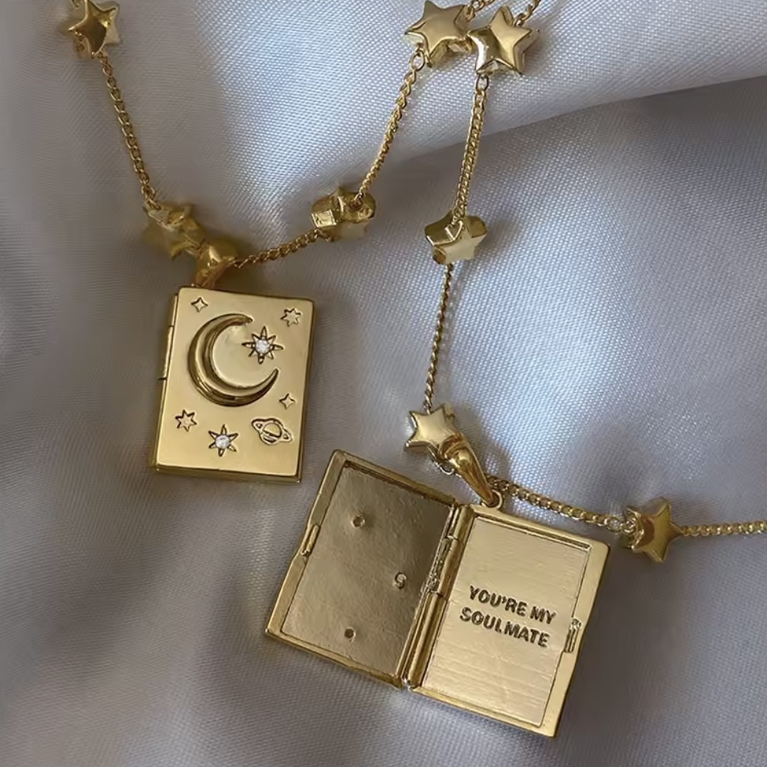Κολιέ ατσάλι επιχρυσωμένο με 18 καράτια κίτρινο χρυσό σε σχήμα βιβλίου ανοιγόμενη που γράφει τη φράση "you are my soulmate" στο εσωτερικό του