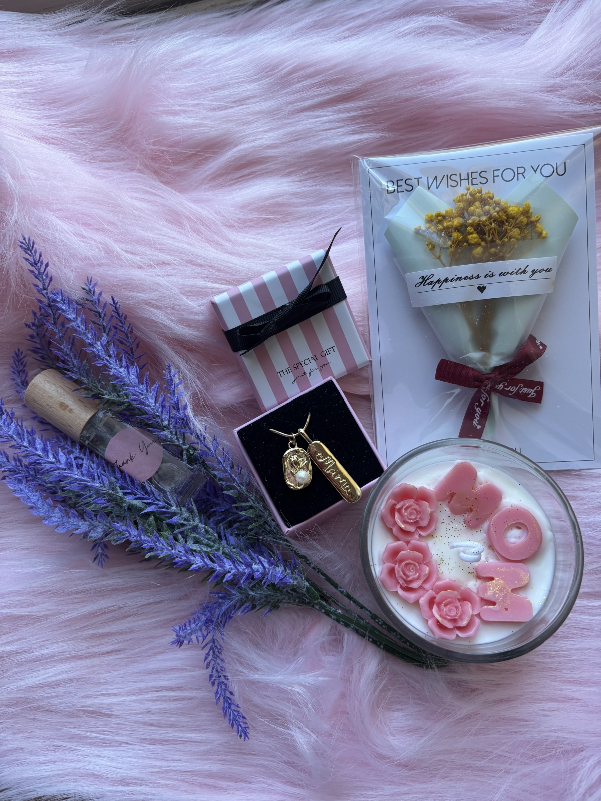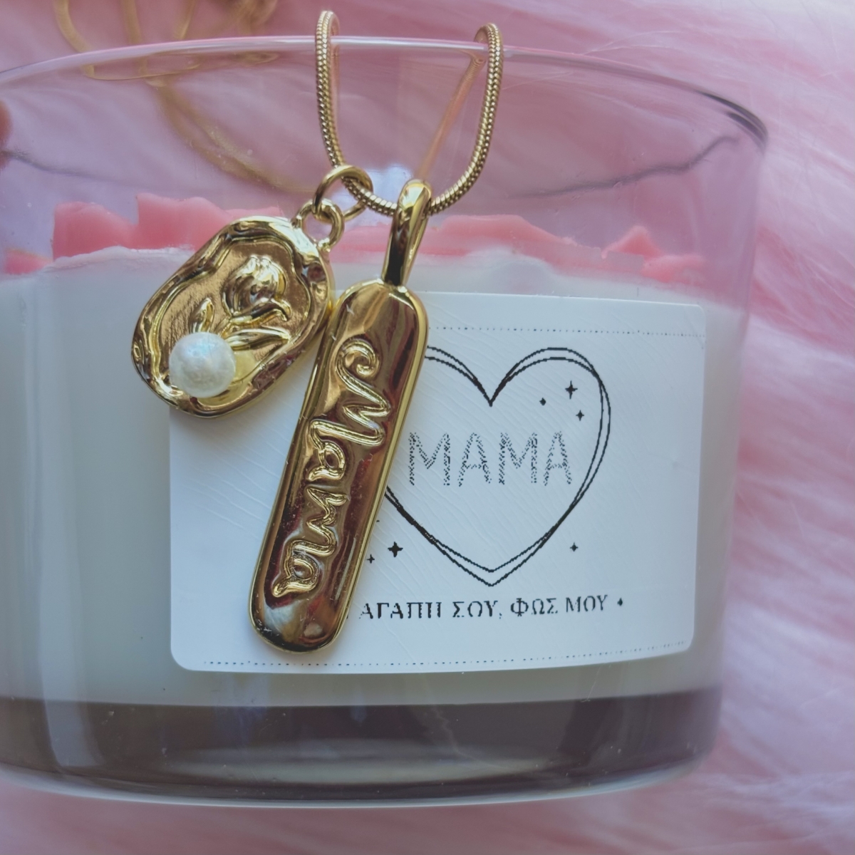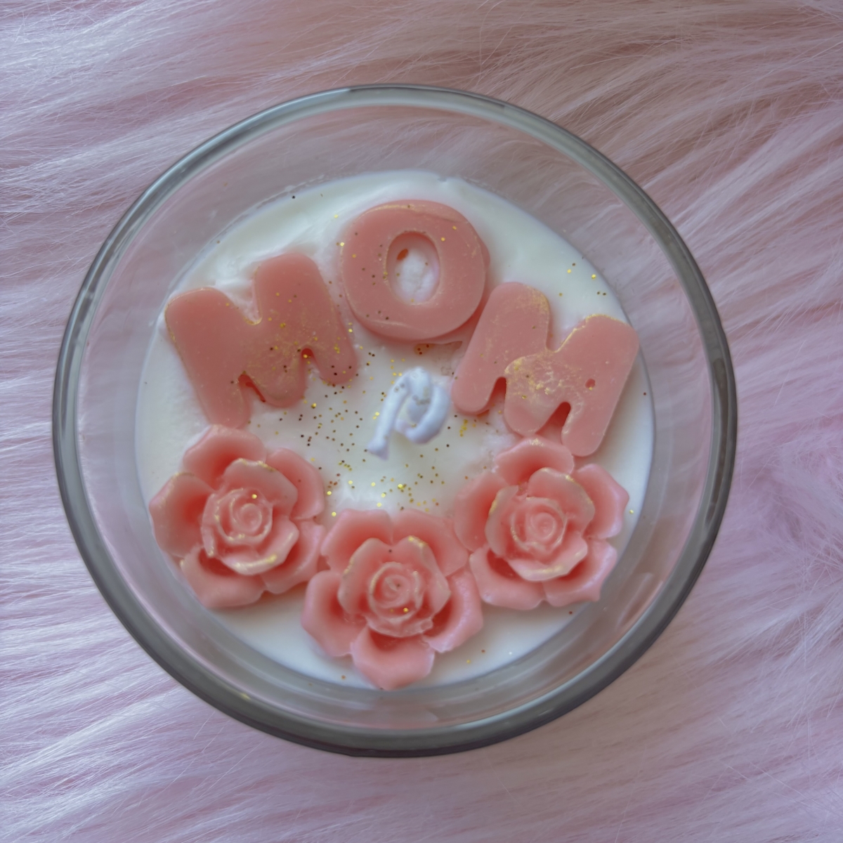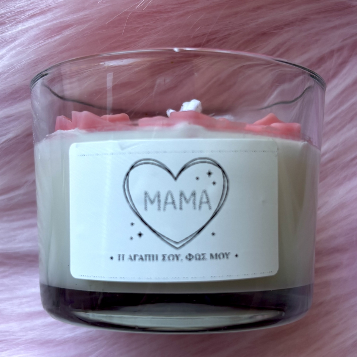 1 χειροποίητο αρωματικό κερί με τη λέξη mom και λουλούδια σε ροζ απόχρωση σε μυρωδιά πούδρας με αυτοκόλλητο "ΜΑΜΑ ή αγάπη σου, φως μου"
