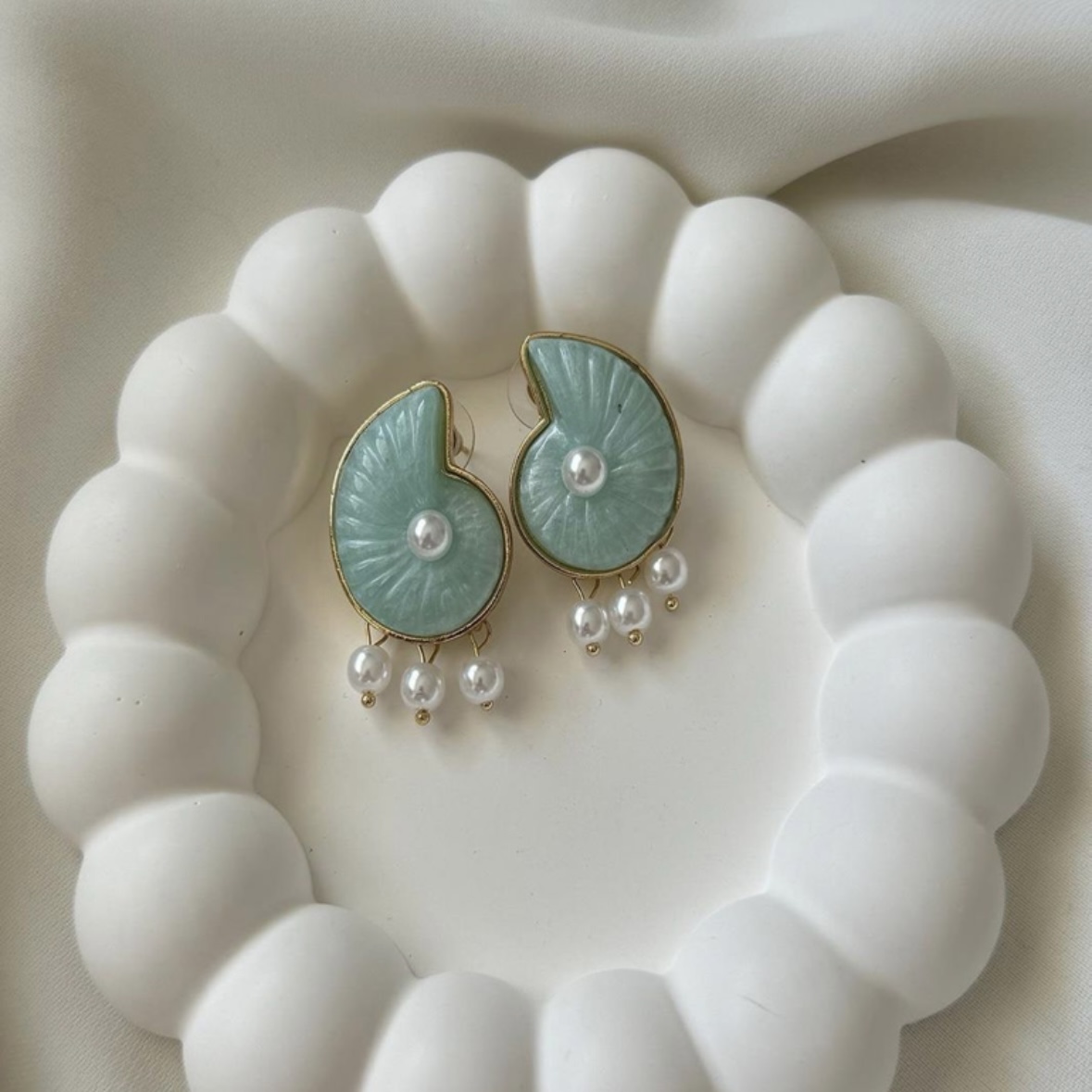 Σκουλαρίκια από ορείχαλκο επιχρυσωμένα με 18 καράτια κίτρινο χρυσό κοχύλια στο χρώμα μέντας με περλες