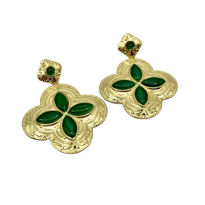 Σκουλαρίκια ορείχαλκος επιχρυσωμένος με 18Κ κίτρινο χρυσό σε σχήμα σταυρού με πράσινα ζιρκόν αριστης ποιότητας και περιμετρικά ανάγλυφα σχέδια