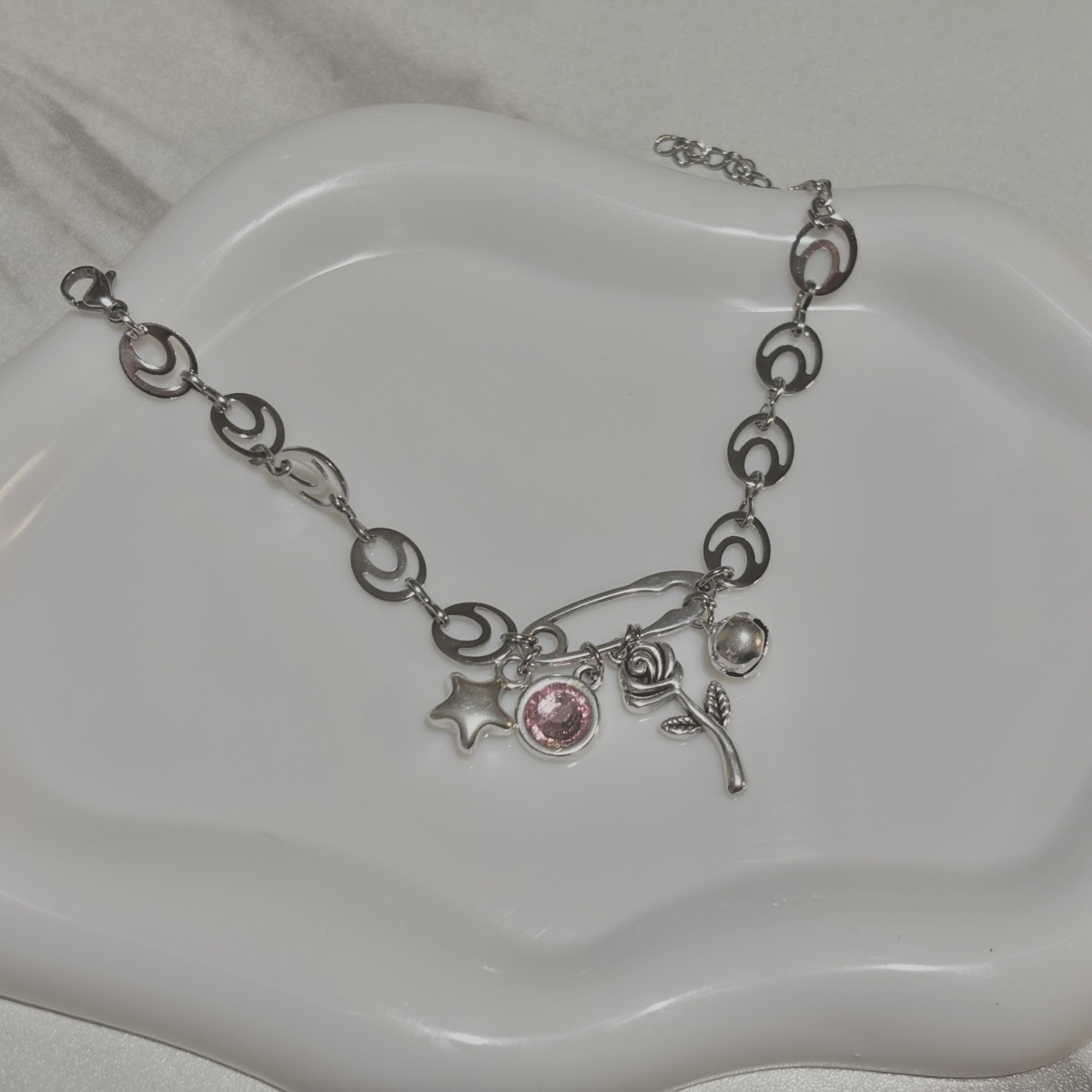 Βραχιόλι ατσάλι σε ασημί απόχρωση με διάφορα charms ατσάλινα και πέτρα Swarovski