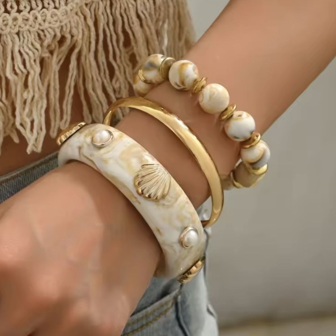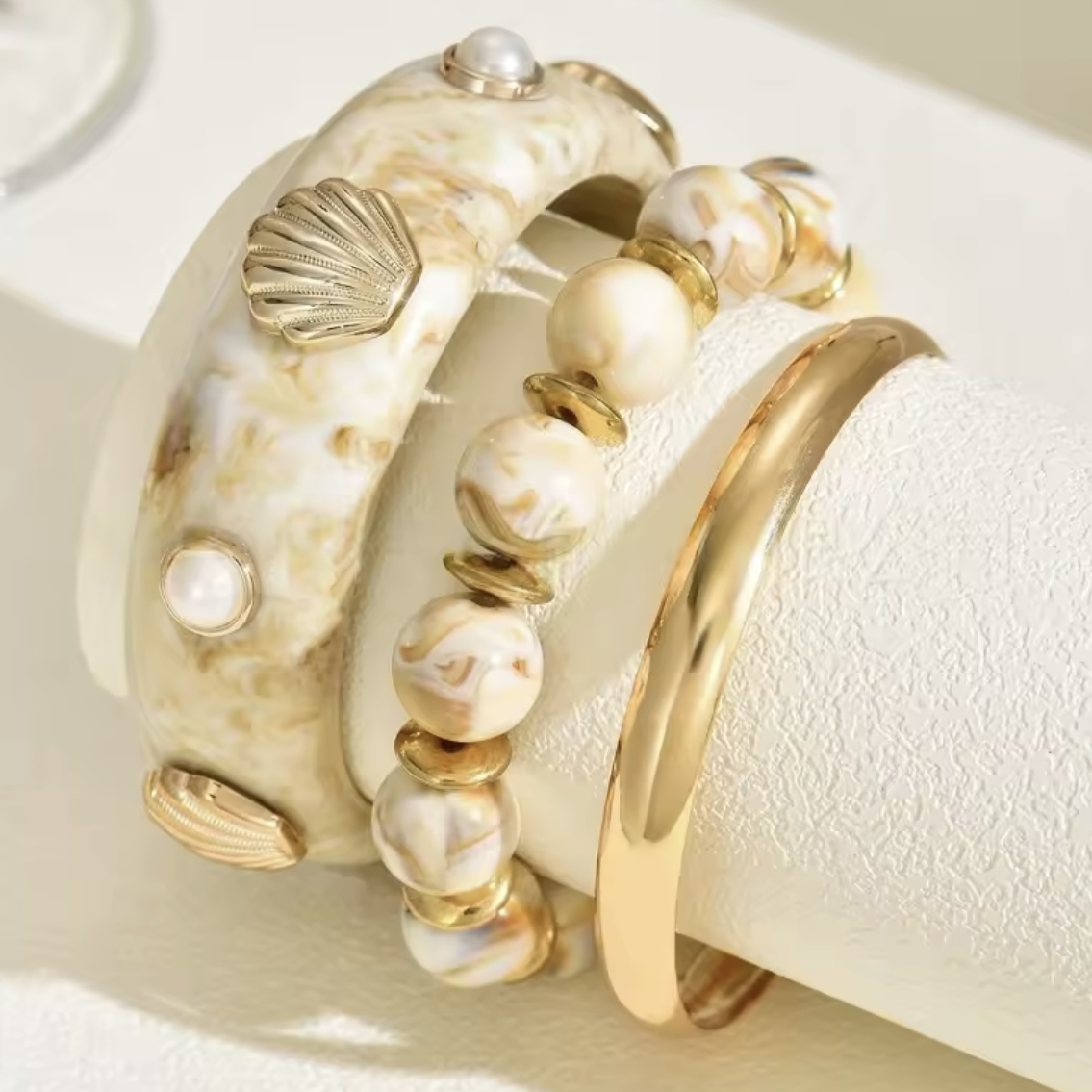 Τριπλό σετ βραχιολιών σε μπεζ αποχρώσεις με ατσάλινα στοιχεία επιχρυσωμένα με 18 καράτια , αποτελούμενα επισης από ριτίνη
